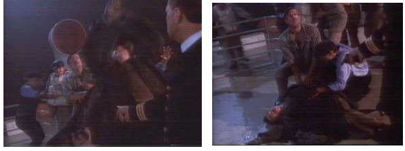 Pulling out his revolver, Murdoch says: “I’ll shoot the next man who moves!” At that a man breaks forth from the crowd and is cut down by a single blast from Murdoch’s gun. Looking at the body of the man on the deck, Murdoch then whispers under his breath, “Damn you” and turns to his two fellow officers who have been standing behind him during all this. They look bewildered by Murdoch’s actions (incredibly, these two officers are supposedly Lightoller and Boxhall!). Murdoch then says: “Well gentlemen, I suppose it’s every man for himself.” He then puts the gun to his head, at which Boxhall shouts “Murdoch!” just before the First Officer shoots himself. Officer Boxhall, being restrained by Lightoller, then says quietly: “My God, why have you deserted us?”