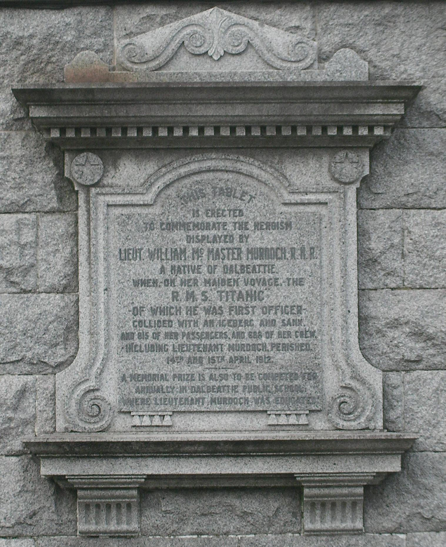 "This tablet is erected to commemorate the heroism displayed by Lieut. William McMaster Murdoch R.N.R a native of Dalbeattie. When, on her maiden voyage, the R.M.S. Titanic of which he was first officer collided with an iceberg and sank and 815 of her passengers and 688 of her crew including Lieutenant Murdoch perished, 14th and 15th April, 1912.