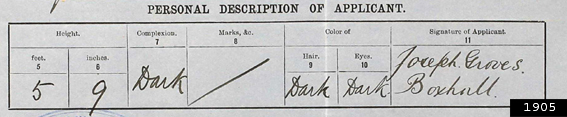 Notes: :Boxhall's height is described as 5 ft 8 (1903), and 5 ft 9 (1905/1907). He had a dark complexion, dark brown hair and dark brown eyes. In fact several of his applications simply read "dark", "dark", "dark". His Ellis Island records state 5' 8" and that he weighed 154 lbs.