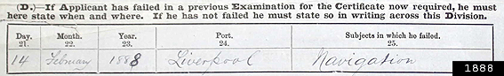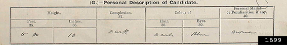 Notes: Unfortunately, as can be seen below, the section in his Extra Master's application (1888) where the applicant is to fill in his height and other descriptive information has frustratingly been crossed out, either by Smith or the examiner. The reason for this is unknown. The height of 5'8" is deduced upon photograph evidence and is based on several photographs in which in relationship to other officers he is slightly shorter. It is also interesting to note he failed in "Navigation".