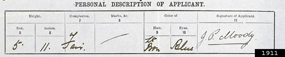 Notes: Moody is listed as 5 ft 11 (1907-1911), fair complexion, light brown hair and blue eyes. Unlike the other officers, there are no variations in height or other details in his applications, all are exactly the same.
