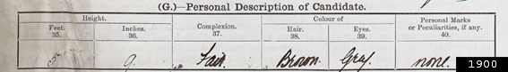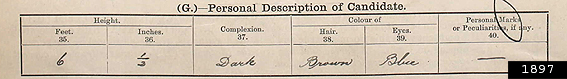 Notes: There is a difference of half a foot between the two descriptions Murdoch provided (First Mate in 1895 and Extra Master 1896). His skin colour is described as fair and his eyes hazel coloured -described as both "hazel grey" and "hazel brown". Interestingly he is the only one out of Titanic's officers to have passed all his applications on first attempt.