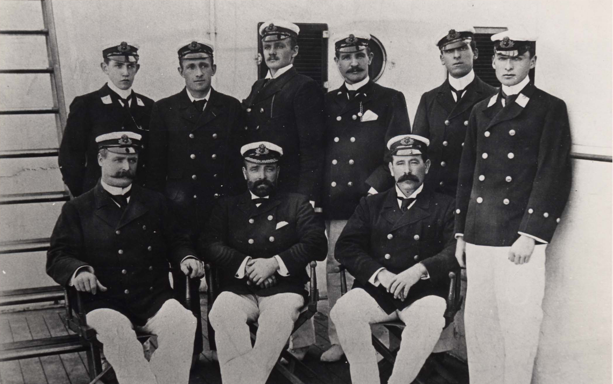 The first surviving photograph of William Murdoch was taken in 1902 on the Medic, apparently in Australia; it shows a relaxed young man, age 28 or 29, sporting a splendid mustache which no doubt required a good bit of attention, handsome in summer uniform. Murdoch was the ship's First Officer, and standing to his right is Charles Herbert Lightoller, the Second Officer. Lightoller has struck a pose reminiscent of that favored by prize fighters of the era. Murdoch, the military cut of his uniform jacket relieved by a perfectly folded white handkerchief and what appears to be a fob on a chain, is much more poised. He seems to be the only man in the picture enjoying the moment.