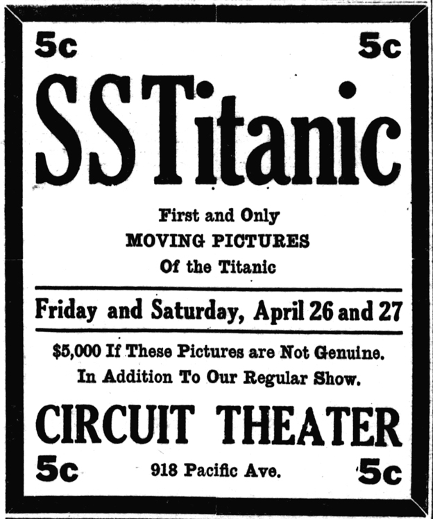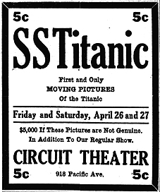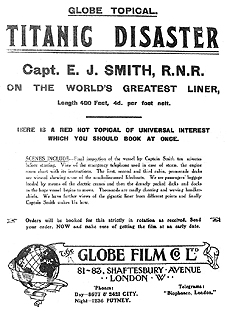 A deceptive advertisement for a British Titanic newsreel; the carefully worded advert obscures the fact that the footage was actually of the RMS Olympic, shot a year earlier. (Click image to enlarge)