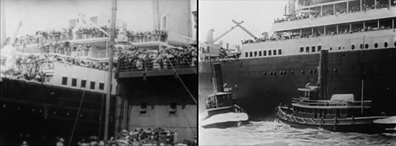 Some newsreels also include the above two shots, both of which are neither Titanic or Olympic class ships. The shot on the left of crowds waving goodbye to a ship departing is of ship that is yet to be identified. The ship on the right is most likely the SS Lusitania.