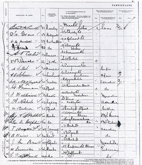 Crew agreements for Olympic's maiden voyage. The signature of Captain Smith and his seven officers appear at the top of the page. Courtesy Public Record Officer, Kew. (Click image to enlarge)