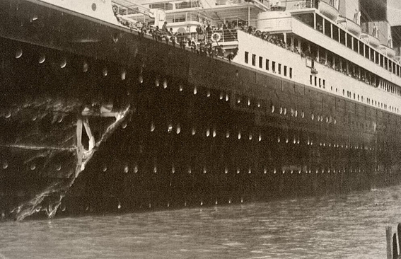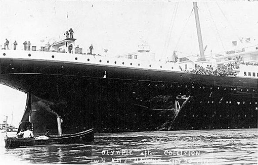 Olympic was damaged badly enough to force the voyage to be cancelled. Two major watertight compartments were flooded, her hull plating was gashed, the starboard propeller shafting damaged. Photos after the collision show the liner down at the stern... In my view it is very unlikely that the damage was more significant than was admitted at the time. The hearings following the Olympic/Hawke collision included a damage assessment of the Olympic which was agreed upon by both White Star and the Royal Navy, and stated that the Hawke’s bow had penetrated eight feet into Olympic’s hull. (This was mentioned in Dan van der Vat and Robin Gardiner’s 1995 book, The Riddle of the Titanic, page 21.) I think it is impossible that the Olympic’s keel was damaged in the collision, as Robin Gardiner speculates in his 1998 book Titanic: The Ship That Never Sank? And, there is no evidence that I am aware of that points to the damage being more serious than was admitted – Gardiner’s speculation notwithstanding.