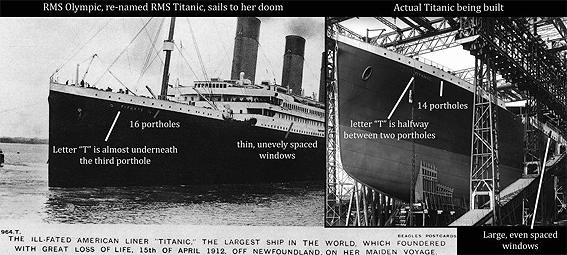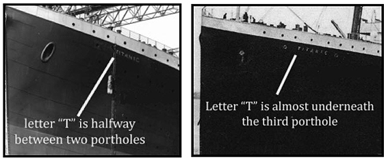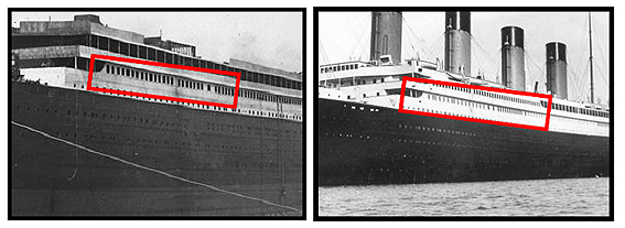 These above images are used by conspiracy theorists alleging a difference in portholes. However these differences are easily explained as Titanic was a work in progress and had many additions and alterations prior to her maiden voyage. (Click to enlarge)