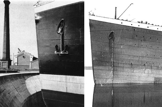 Above left: Olympic taken when the vessel was in the Thompson Graving Dock in 1911, allegedly shows her to have had a vertical joint in her hull plating immediately forward of the port side anchor hawse pipe.