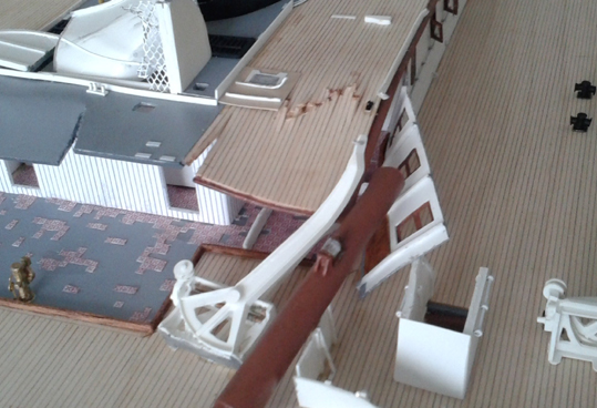 According to photographs and reports from the wreck, there is next to nothing left of the cabin. One can see why that is the case when viewing Jason King's fantastic 1:100 scale Titanic wreck model completed in May 2014 that depicts how Titanic possibly looked once she had sank and rested on the sea floor. On it we can see how the forward mast has collapsed onto the portside of the officer's quarters, splitting the wall away, so that little remains of the cabins in that area.