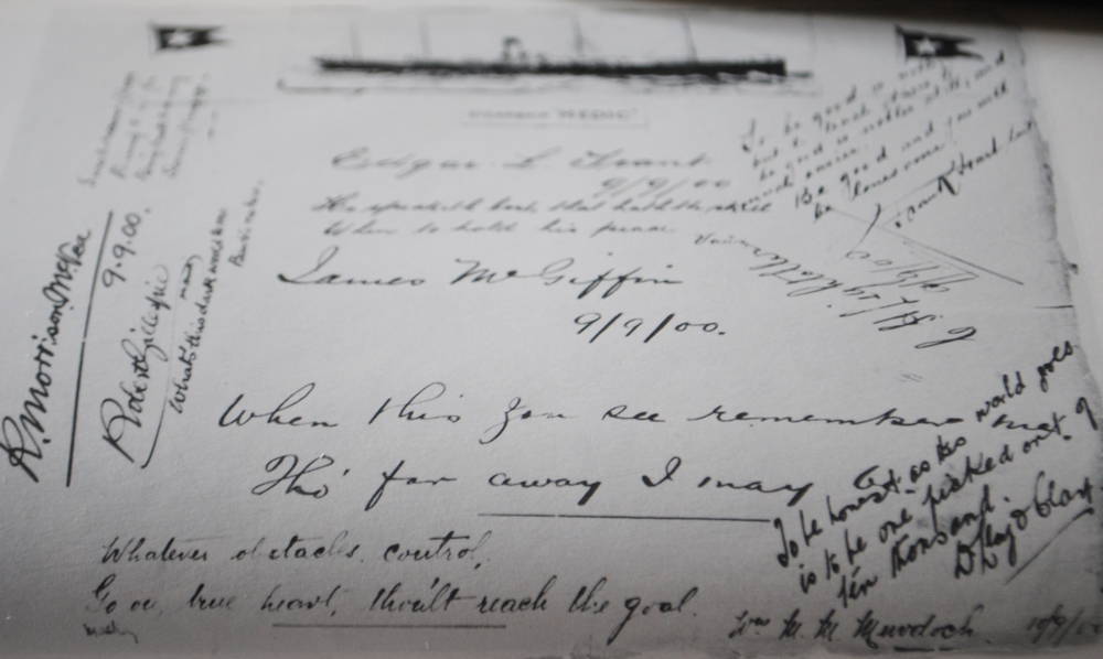 Signature sheet from the Medic's menu signed by the officers on September 9, 1900. At the very bottom of the image Murdoch has quoted a line from a poem by Scottish writer Charles Mackay: "Whatever obstacles control, go on, true heart, thou'lt reach the goal." It is signed the day after the other officers: "W.M.M.Murdoch 10/09/00" (Click image to enlarge)