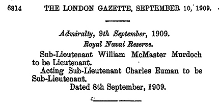 Announcement that Murdoch had been promoted to RNR Lieutenant in the London Gazette of September 10, 1909. (Courtesy of Valeria Gallone.)