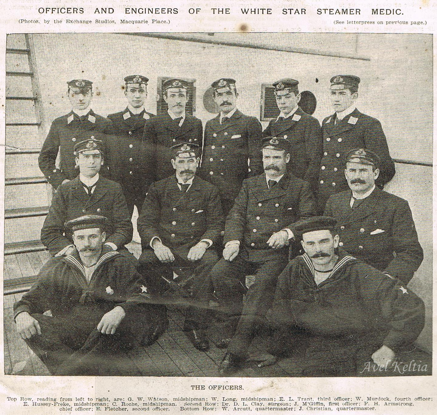 A photograph of the crew of the Medic in Melbourne 1900 (below), shows fourth officer William Murdoch standing next to second officer Charles Herbert Lightoller. According to an article in an Australian newspaper, "The Menzies Miner" dated Saturday June 28, 1900 the photograph was a special occasion for the crew. Researcher Petra Feyahn explains: