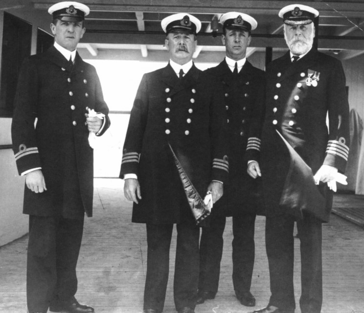 In the above photographs we see a clear full body shot that reveals him to be tall, lean and a modest gentleman. Note Murdoch has two strips on his sleeve, marking him as First Officer, while Smith has four, as Captain. Regarding this photograph, Elizabeth Gibbons writes: