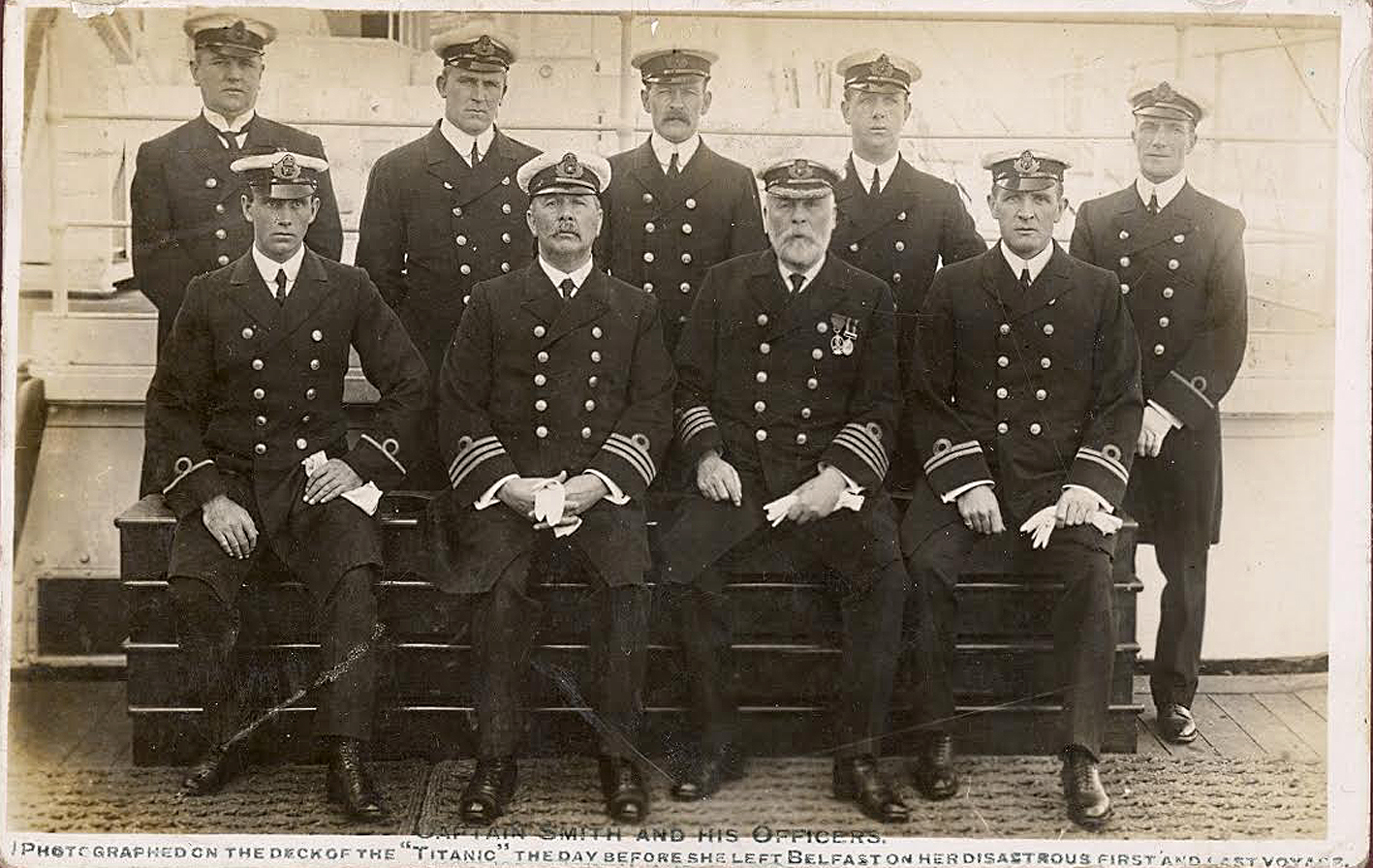 Olympic's officers. Standing: Standing: Purser Hugh McElroy 3rd Officer Henry O. Cater, 2nd Officer Robert Hume, 4th Officer David W. Alexander, 6th Officer Harold Holehouse. Seated: 5th Officer Alphonse Martin Tulloch, Chief Officer Joseph Evans, Captain Edward John Smith, and 1st Officer William McMaster Murdoch. (Click image to enlarge)