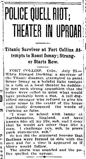 However during one the lectures a member of the audience challenged his "hateful" description of Ismay which according to the Denver Rocky Mountain News of July 26 1912 began a row that was severe that the "police were called to quiet what would have probably been a riot."